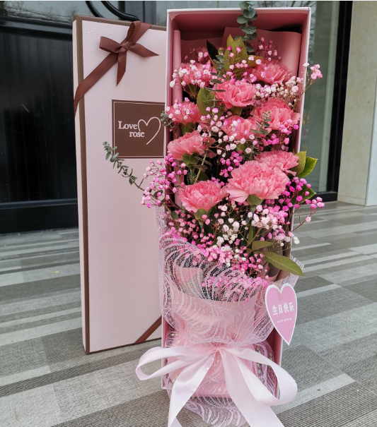 材质: 11枝粉色康乃馨,粉色满天星,尤加利叶搭配