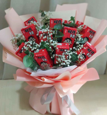 材质: 11盒旺仔牛奶(125ml),满天星,绿叶搭配