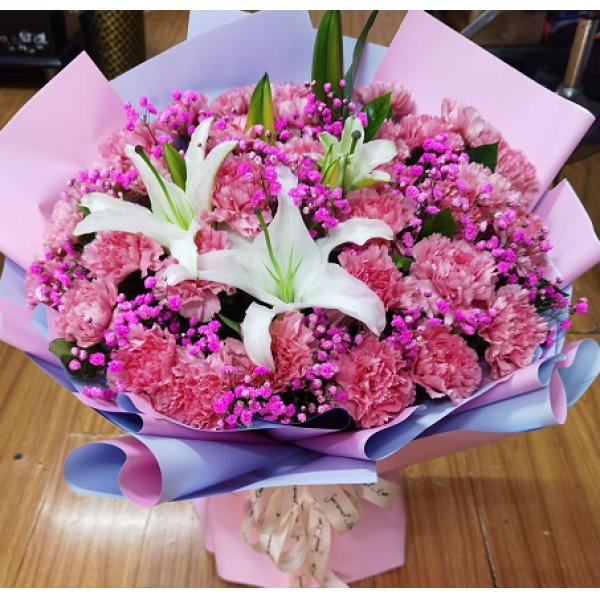 材质: 33枝粉色康乃馨,5朵百合,粉色满天星搭配