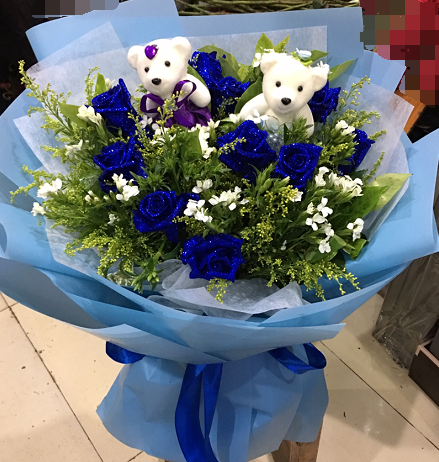 材质: 11枝蓝色妖姬,黄英,相思梅搭配,2只小熊