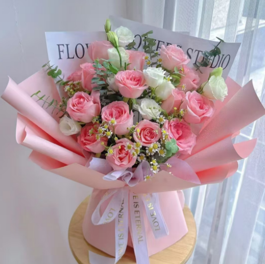 材质: 15朵戴安娜玫瑰 桔梗,小雏菊,尤加利叶搭配