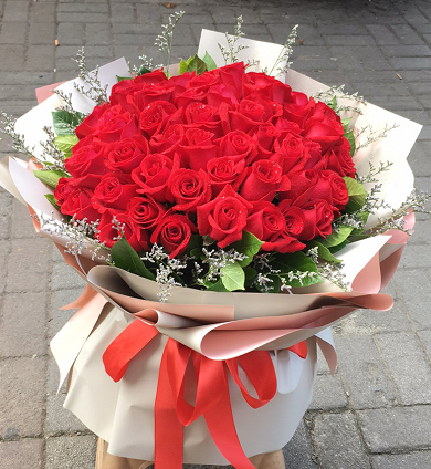 材质: 精选52枝红玫瑰,搭配绿叶情人草