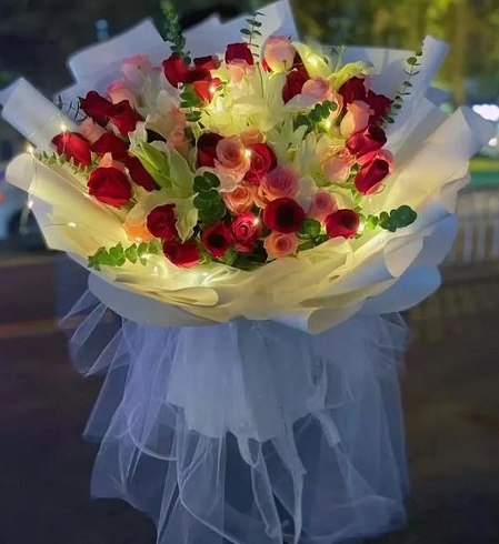 材质: 52枝玫瑰混搭,8朵百合,彩灯,尤加利叶搭配