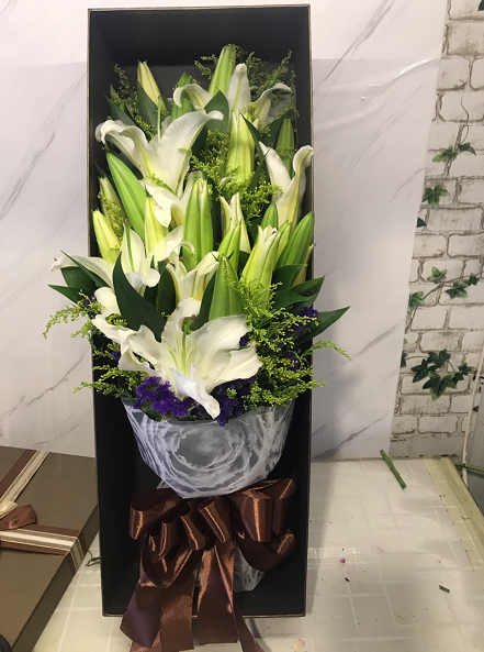 材质: 9枝多头白百合,搭配勿忘我,黄英