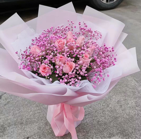 材质: 11枝戴安娜玫瑰,搭配粉色满天星