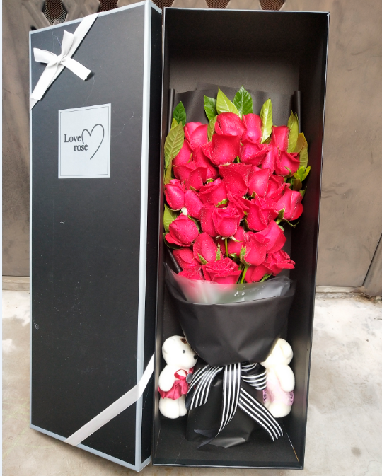 材质: 精选29枝红玫瑰 ,2只小熊,栀子叶搭配