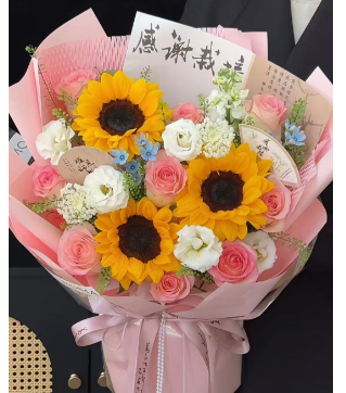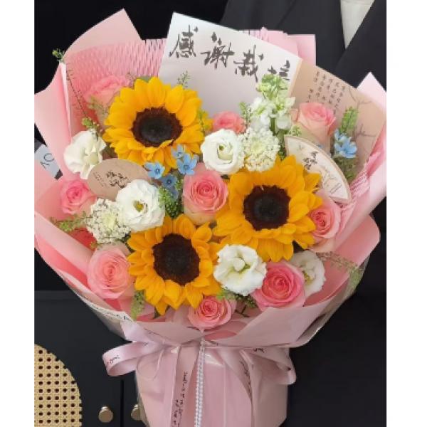 材质: 精选9枝戴安娜,3枝向日葵,1枝白色紫罗兰,2枝翠珠,桔梗,蓝星花,绿铃草搭配