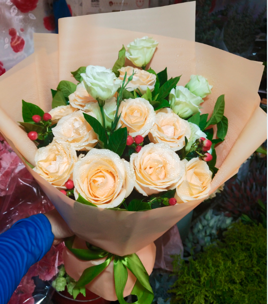 材质: 精选11枝香槟玫瑰,桔梗 红豆 栀子叶搭配