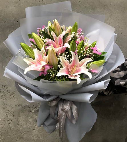 材质: 精选16朵粉百合,搭配满天星,相思梅
