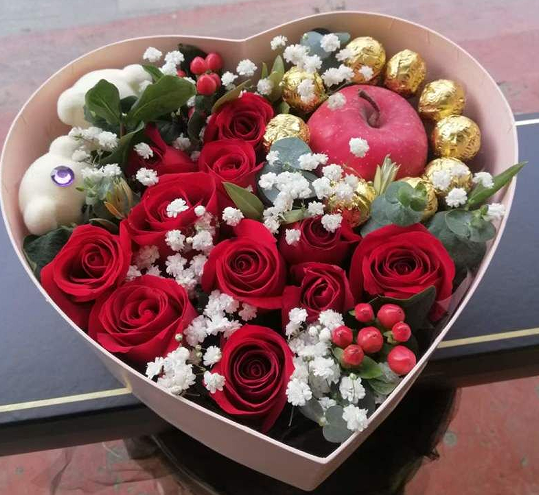 材质: 11枝红玫瑰,9颗巧克力,2只小熊,满天星,红豆,尤加利叶,栀子叶丰满