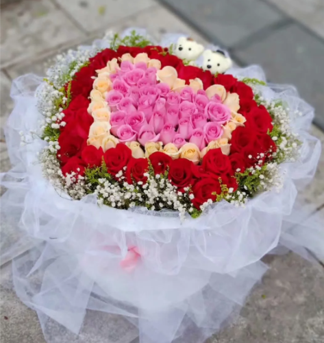 材质: 红玫瑰,香槟玫瑰,紫玫瑰共99枝包扎成心型,黄英满天星围边