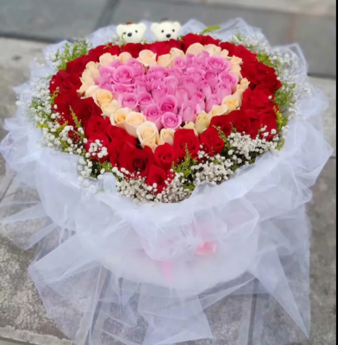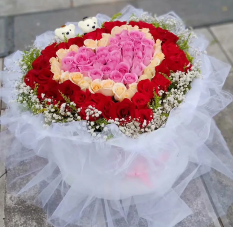 材质 红玫瑰,香槟玫瑰,紫玫瑰共99枝包扎成心型,黄英满天星围边