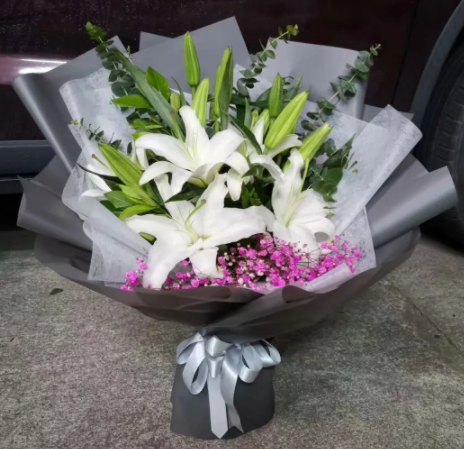 材质: 精选16朵白百合,搭配粉色满天星 尤加利叶