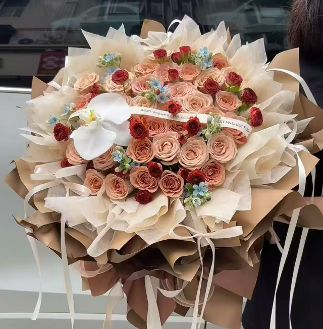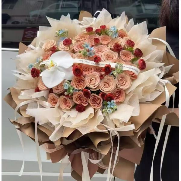 材质: 33枝卡布奇诺,1只蝴蝶兰,蓝星花,橙色泡泡丰满,丝带如图制作