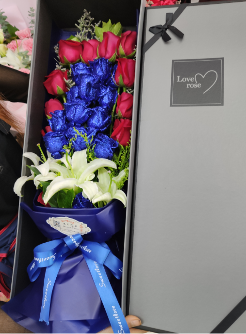 材质: 14枝蓝色妖姬,11枝红玫瑰,4朵白百合,黄英情人草点缀