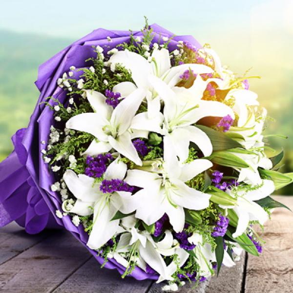 材质: 13枝顶级香水百合,紫色勿忘我满天星点缀
