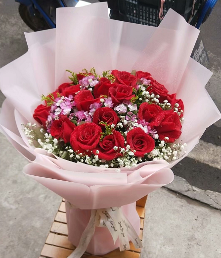 材质: 精选19枝红玫瑰,相思梅,满天星,黄英搭配点缀