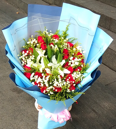 材质: 精选33枝红玫瑰,8朵白百合 黄英满天星点缀