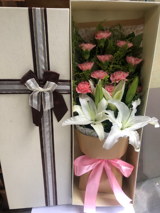 材质: 11朵康乃馨,2枝百合 黄莺点缀