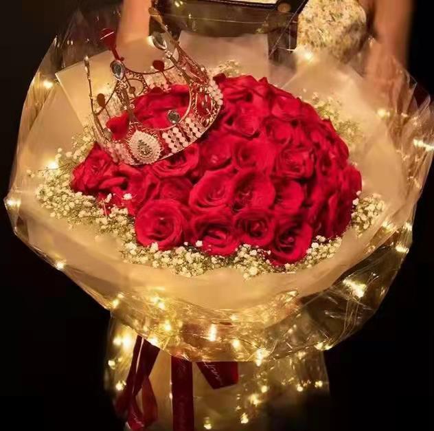 材质: 52枝红玫瑰,皇冠,彩灯,满天星搭配