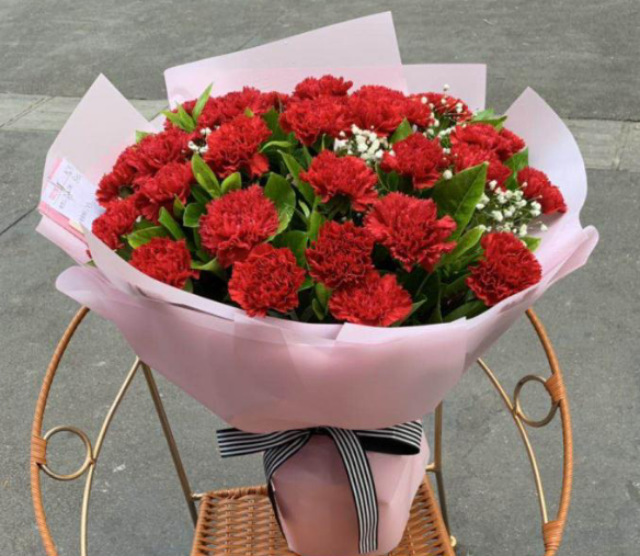 材质: 精选33枝红色康乃馨,绿叶间插,满天星点缀