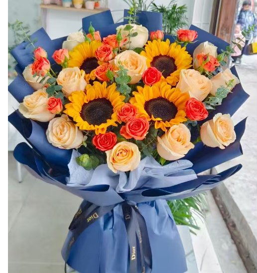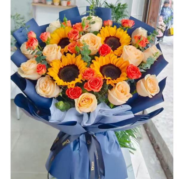 材质: 向日葵4朵,13支香槟玫瑰,5枝多头橙色泡泡,尤加利叶搭配