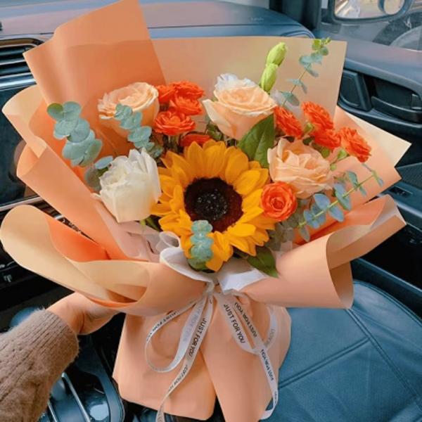 | 材质: | 3枝香槟玫瑰,1枝白玫瑰,1枝向日葵, 3枝多头橙色泡泡,桔梗,尤加利叶搭配 |