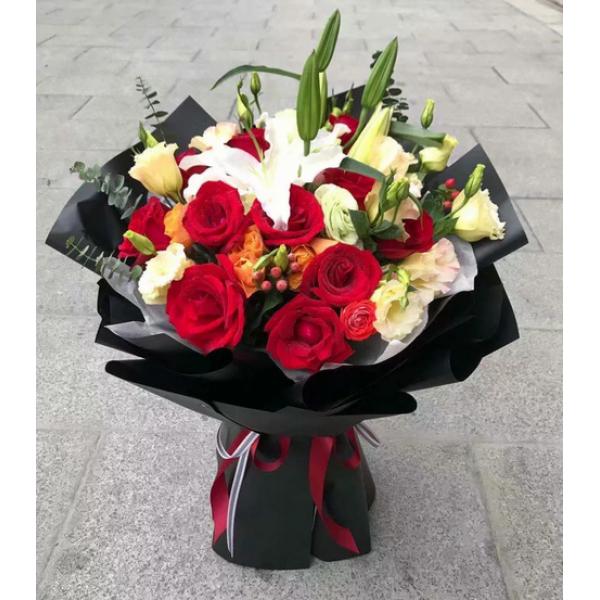 材质: 11枝玫瑰,3枝多头百合,3枝洋桔梗,尤加利叶、相思红豆搭配
