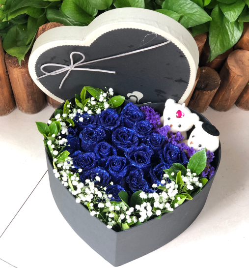 材质: 精选19枝蓝色妖姬,满天星,绿叶搭配,勿忘我点缀 2只小熊