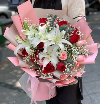 材质: 10枝红玫瑰,9枝戴安娜,6朵百合,满天星,尤加利叶搭配