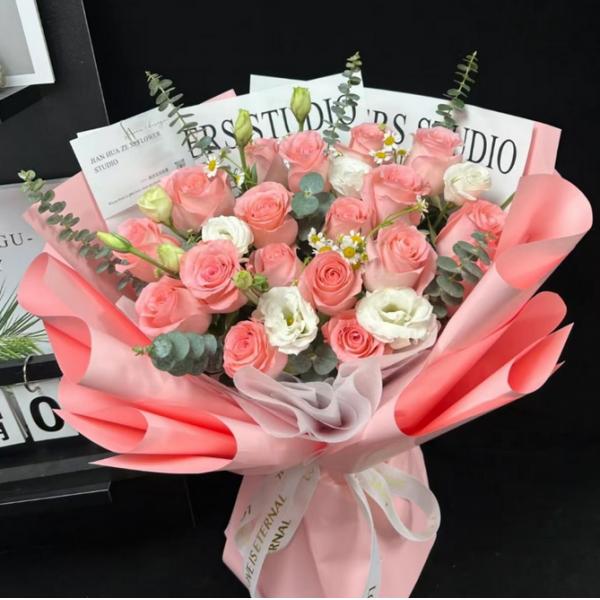 材质: 19枝戴安娜玫瑰,洋甘菊,桔梗 尤加利叶搭配