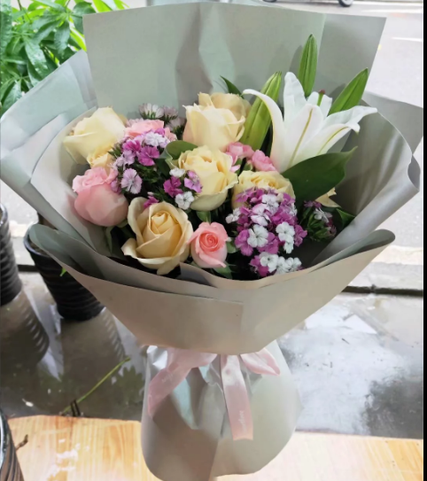 材质 精选5朵粉玫瑰 6朵香槟玫瑰 3朵白百合,