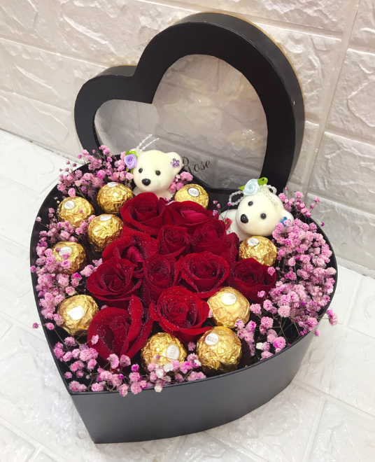 材质: 11朵红玫瑰,10颗巧克力,2只小熊,粉色满天星搭配