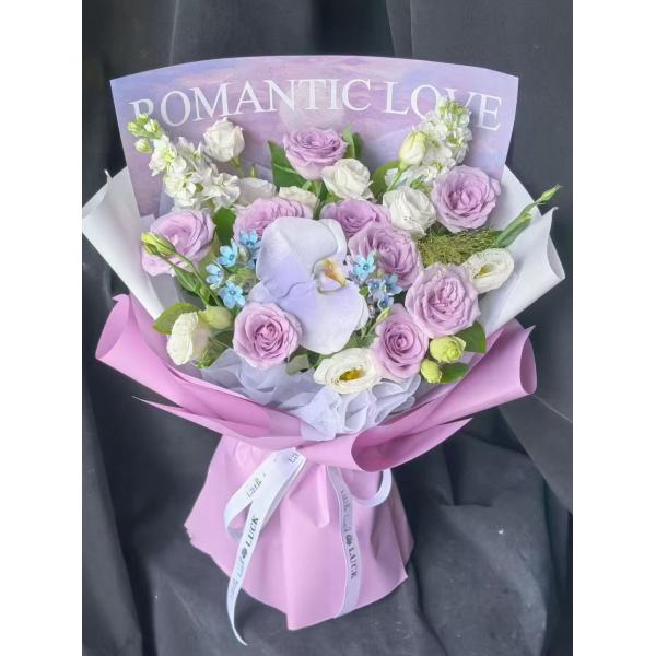 材质: 9朵海洋之歌紫玫瑰,1枝蝴蝶兰,2枝白色紫罗兰,