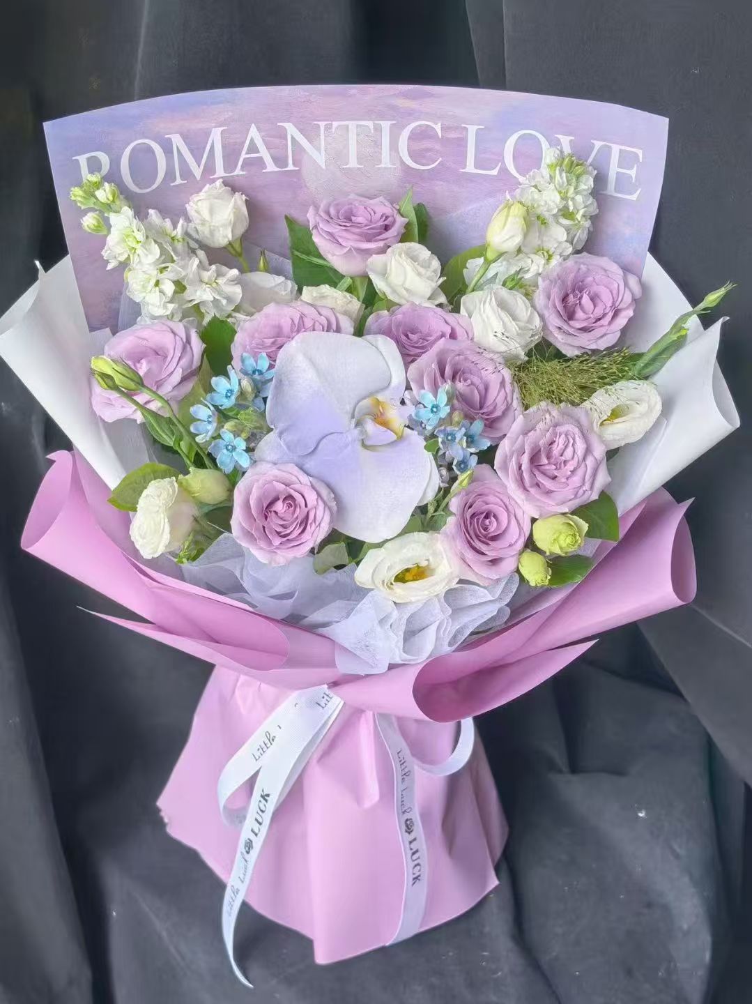 材质 9朵海洋之歌紫玫瑰,1枝蝴蝶兰,2枝白色紫罗兰,