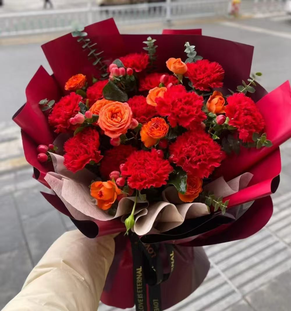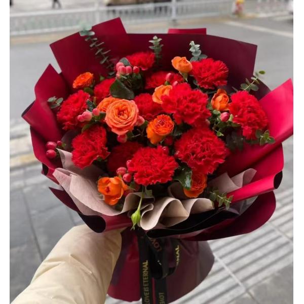 材质: 精选12枝红色康乃馨,橙色泡泡,红豆,尤加利叶搭配