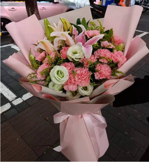 材质: 精选19枝粉色康乃馨,6朵粉百合,桔梗,黄英搭配