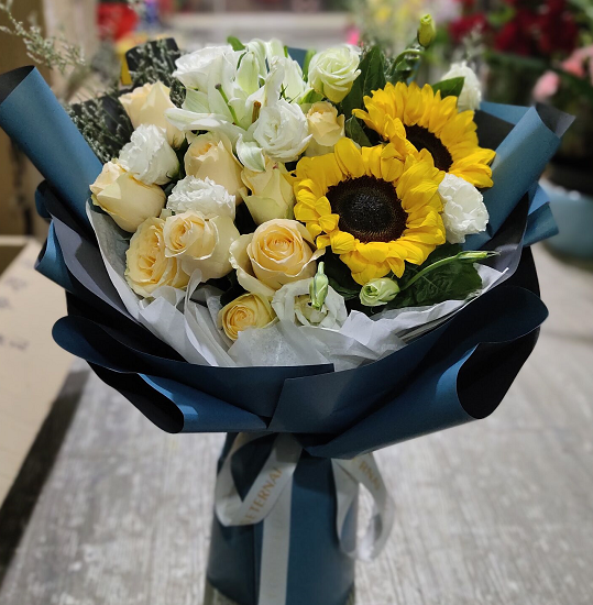 材质: 精选9枝香槟玫瑰,4朵白百合,2枝向日葵,桔梗,情人草点缀