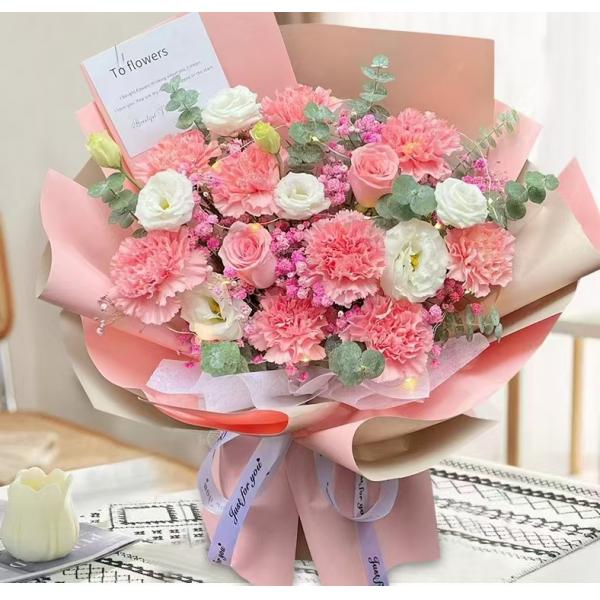 材质: (彩灯)9支粉色康乃馨,2支戴安娜,桔梗,粉色满天星,尤加利叶搭配