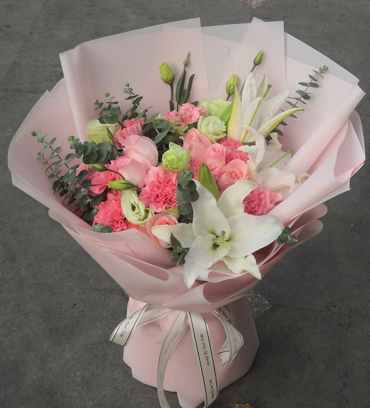 | 材质: | 精选10枝粉色康乃馨,9枝戴安娜玫瑰,6朵白百合。桔梗,尤加利叶点缀 | ||||