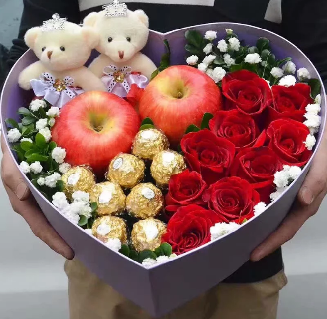 材质: 精选9朵红玫瑰,8颗巧克力,2个平安果,2只小熊,