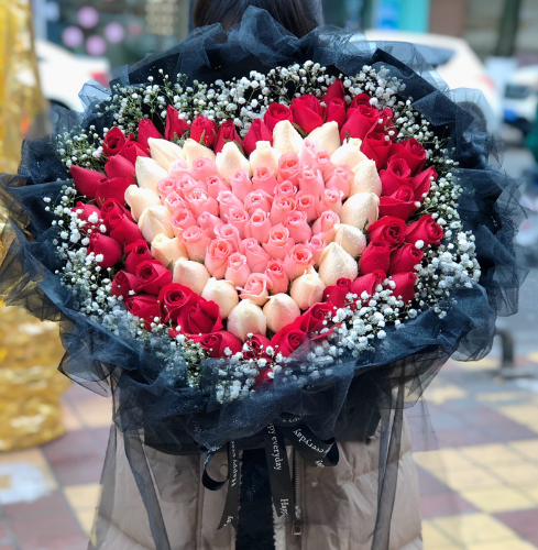 材质: 精选红玫瑰,香槟玫瑰,粉玫瑰共99枝,满天星围边