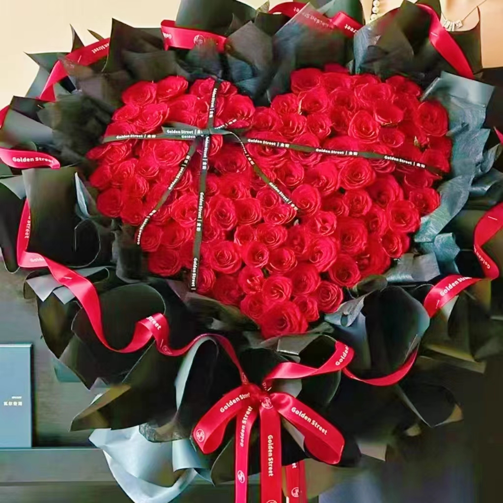 材质: 99枝红玫瑰心形,丝带如图制作