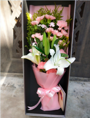 材质 精选16朵粉色康乃馨,5朵白百合。黄英相思梅搭配