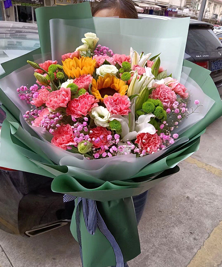 材质: 19朵红色康乃馨,2支向日葵,5朵白百合,小雏菊,洋桔梗,满天星搭配