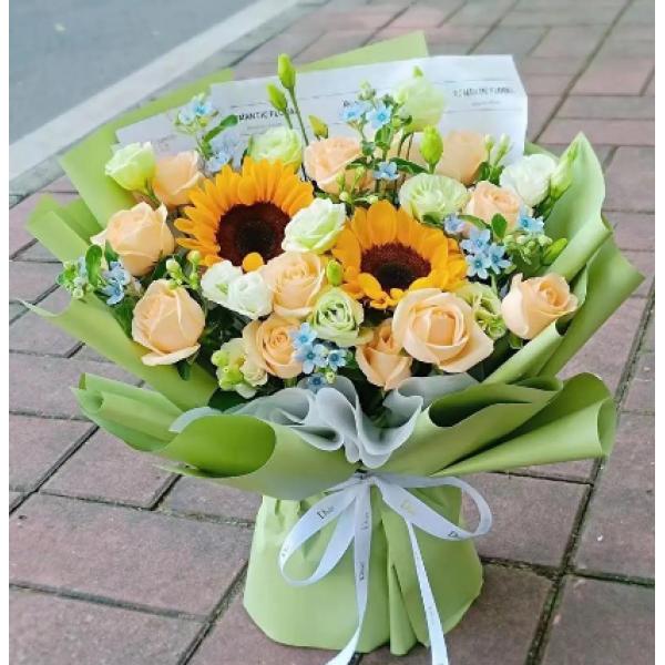 材质: 精选11朵香槟玫瑰,2朵向日葵,桔梗丰满,蓝星花搭配