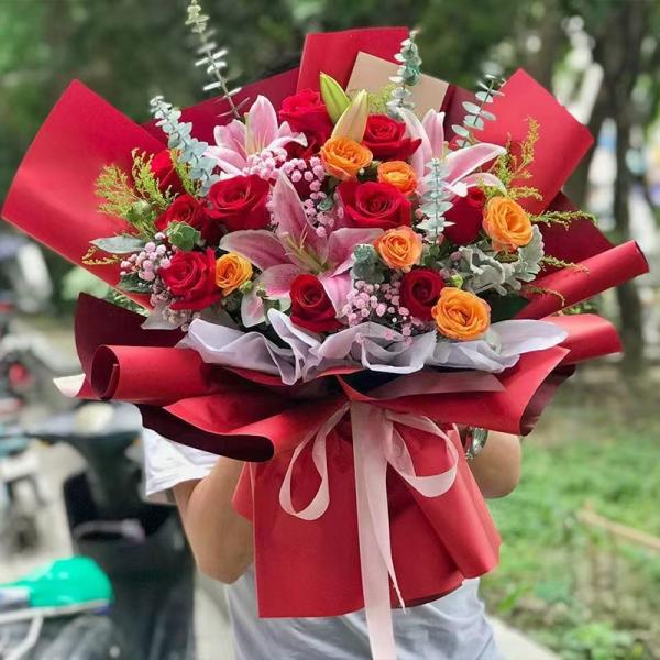 | 材质: | 11枝红玫瑰,5朵百合,3枝橙色泡泡, 黄英,满天星,尤加利叶 搭配 |
