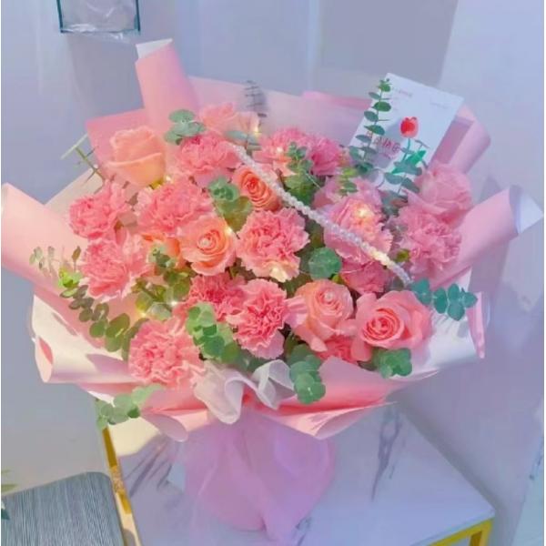 材质: (彩灯+珍珠串)精选13枝粉色康乃馨,8枝戴安娜玫瑰,