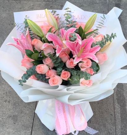 材质 21枝粉玫瑰,3枝多头百合,尤加利叶丰满
