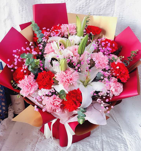 材质: 19枝红粉康乃馨混搭,5朵百合,满天星,尤加利叶搭配